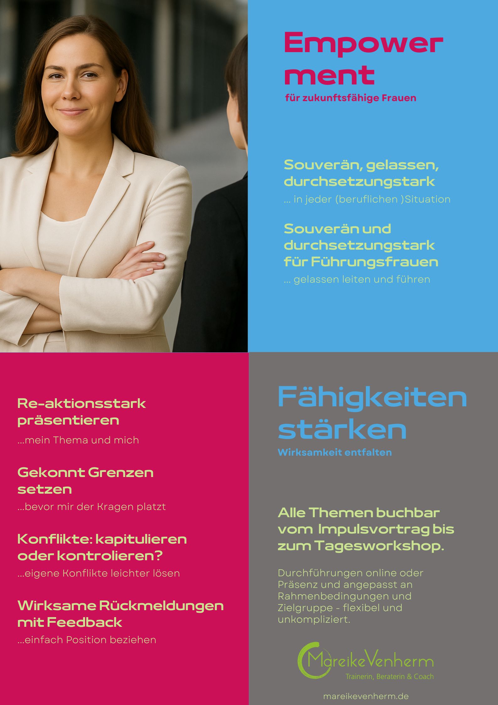 Wenn Sie Frauen in ihrer Führungsrolle stärken wollen, entwickeln wir gemeinsam ein Format, das wirkt – persönlich und wirtschaftlich.